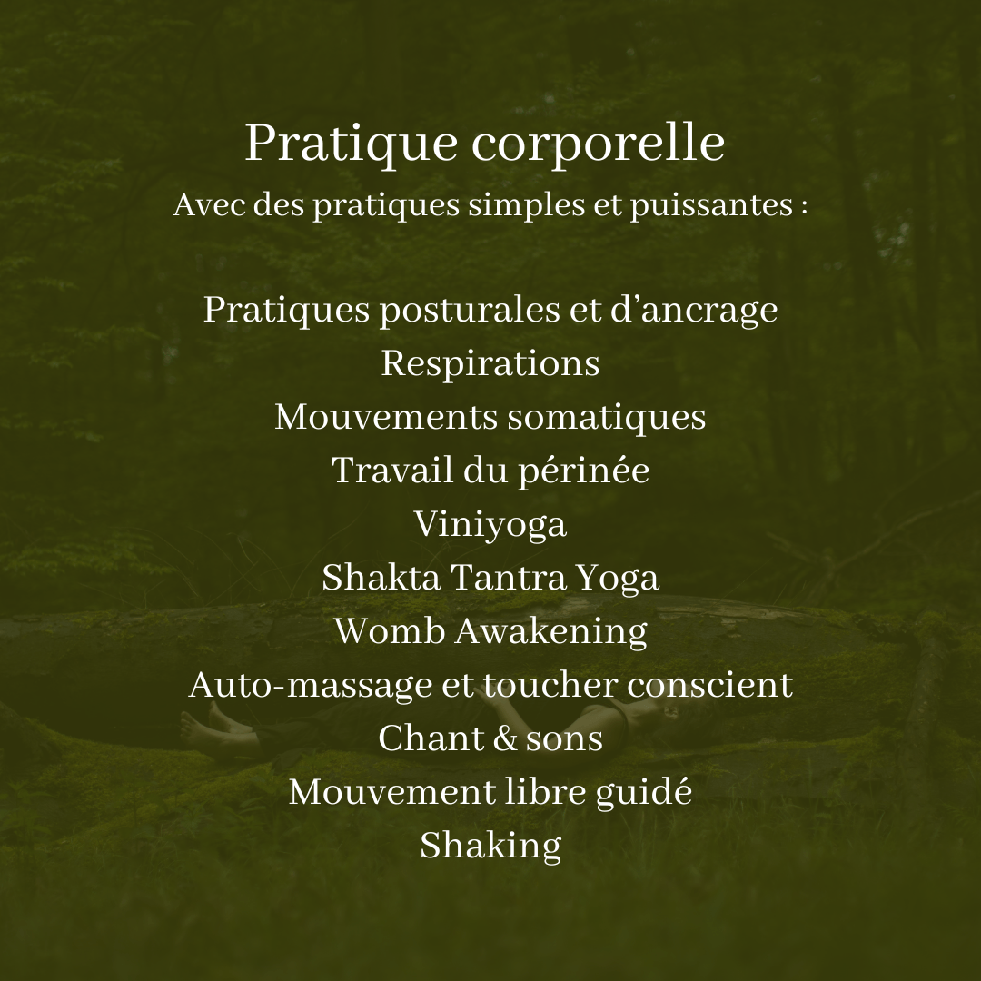 Ces outils viennent du Viniyoga, du Shakta Tantra Yoga, mais aussi d'explorations autour du périnée et du bassin, de pratiques d'ancrage, de danse libre, de mouvements somatiques et j'en passe !